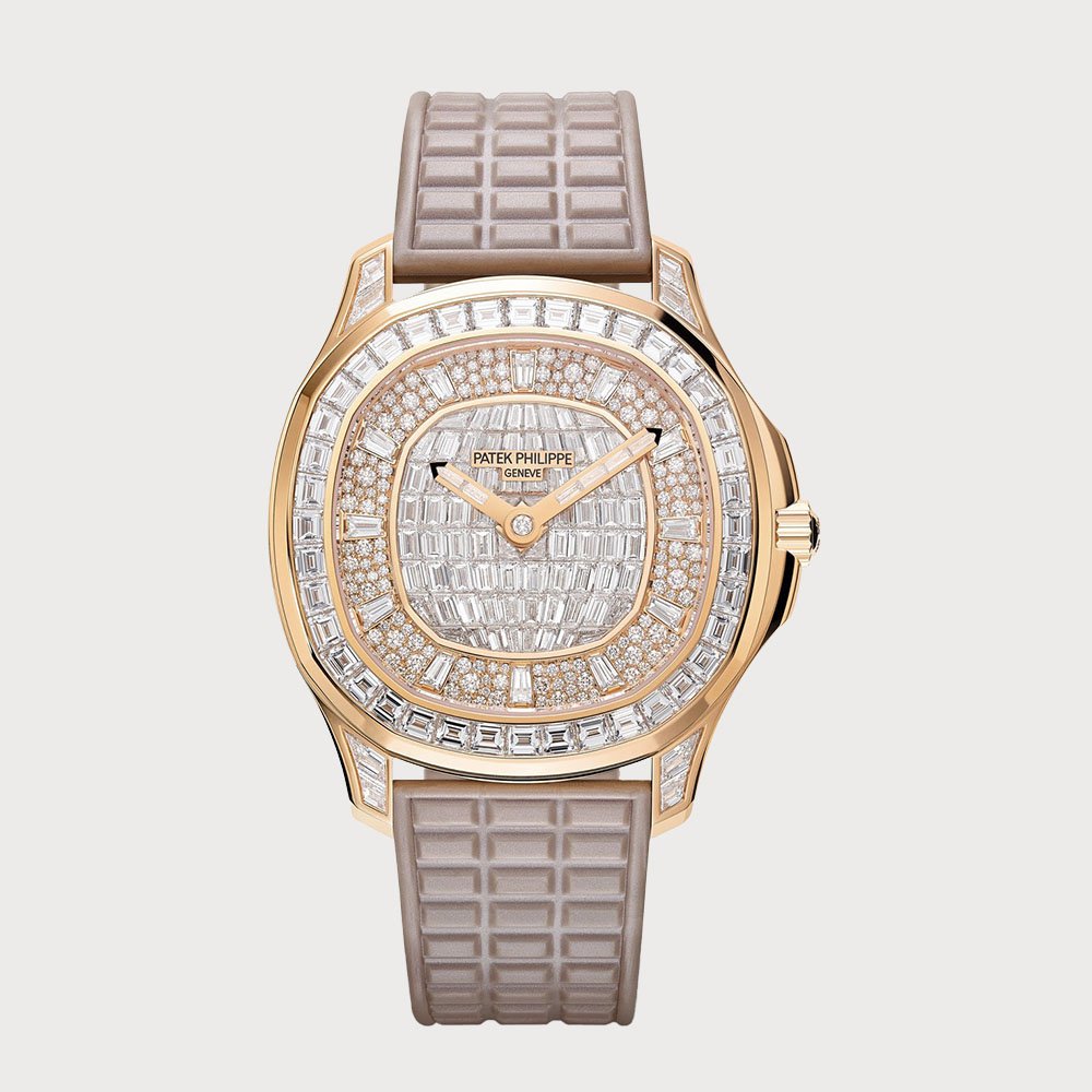 The Patek Philippe Aquanaut Luce Haute Joaillerie 5062/450R-001 is a luxurious timepiece that seamlessly blends elegance with sporty sophistication. Encased in 18K rose gold, this watch features a 38.8 mm case adorned with 48 baguette diamonds (~3.68 ct) on the bezel and lugs, and a dial set with 160 brilliant-cut diamonds (~0.68 ct) and 76 baguette diamonds (~2.6 ct). The hands are also set with baguette diamonds, and a brilliant-cut diamond graces the hour-wheel pipe. The watch is powered by the self-winding mechanical movement Caliber 324, offering a power reserve of at least 45 hours. It is water-resistant up to 30 meters and comes with a pearly beige "Tropical" composite strap, secured by an Aquanaut fold-over clasp set with 10 baguette diamonds (~0.34 ct).