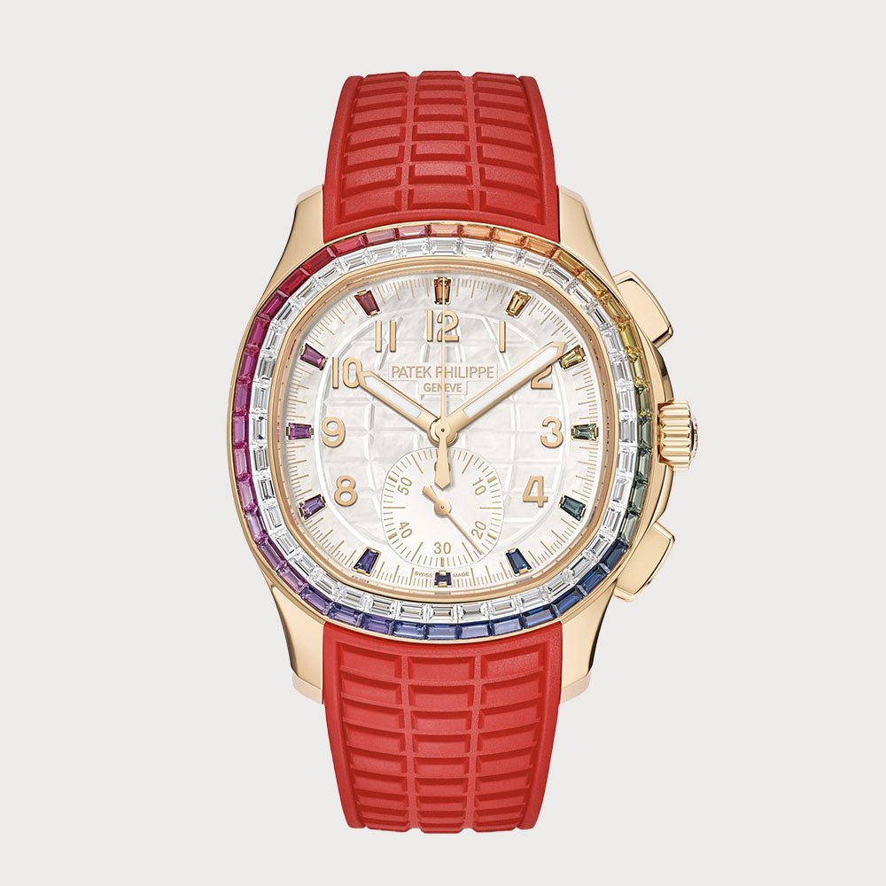 The Patek Philippe Aquanaut Luce "Rainbow" Chronograph (Ref. 7968/300R-001) is a luxurious timepiece designed for the modern, active woman. Crafted in 18K rose gold, it features a white mother-of-pearl dial adorned with multicolored baguette sapphires and diamonds, creating a vibrant rainbow effect. The watch is powered by the self-winding Caliber CH 28-520 movement, offering a flyback chronograph function and a 60-minute counter. It comes with three ultra-resistant composite straps in red, matte beige, and matte white, each secured with a diamond-set fold-over clasp. With a case diameter of 39.9 mm and water resistance up to 30 meters, this timepiece combines sporty elegance with sophisticated craftsmanship.