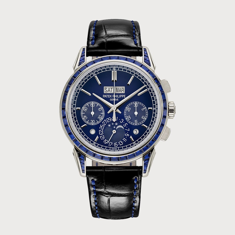 The Patek Philippe Grand Complications Ref. 5271/11P-010 is a luxurious timepiece that seamlessly blends traditional watchmaking with exquisite craftsmanship. This model features a manually wound mechanical movement, the Caliber CH 29-535 PS Q, which powers its chronograph and perpetual calendar functions. The dial showcases a lacquered blue finish with a black-gradient rim and gold applied hour markers, complemented by a shiny black alligator leather strap with contrasting blue stitching. The case is crafted from platinum, measuring 41 mm in diameter and 12.7 mm in height, and is water-resistant up to 30 meters. Adding to its elegance, the watch is adorned with 80 blue baguette-cut sapphires totaling 5.16 carats, set on the bezel, lugs, and clasp. This timepiece is a testament to Patek Philippe's dedication to precision and luxury.