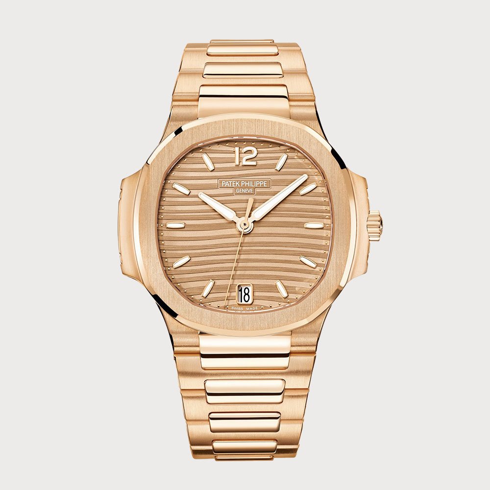 The Patek Philippe Nautilus 7118/1R-010 is a luxurious ladies' automatic watch that reimagines the sporty-chic design of the Nautilus collection. Encased in 18K rose gold, it features a golden brown opaline dial with gold applied hour markers and numerals, all protected by a sapphire crystal case back. The watch is powered by the self-winding Caliber 26-330 S C movement, offering a power reserve of up to 45 hours. The integrated rose gold bracelet, combining polished and satin finishes, is secured with a Nautilus fold-over clasp.