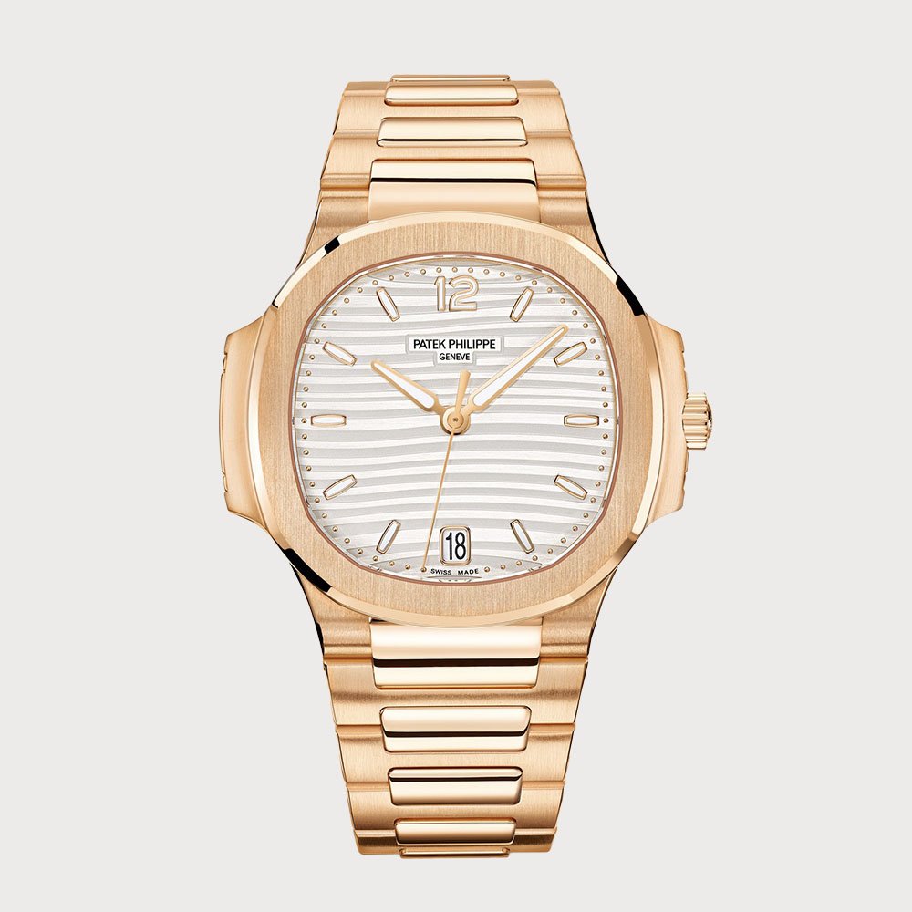 The Patek Philippe Nautilus 7118/1R-001 is a luxurious timepiece that seamlessly blends sporty elegance with refined craftsmanship. Encased in 18K rose gold, this watch features a silvery opaline dial adorned with gold applied hour markers and numerals, all protected by a sapphire crystal. Powered by the self-winding Caliber 26-330 S C movement, it offers a power reserve of up to 45 hours. The 35.2 mm case is water-resistant up to 60 meters, and the rose gold bracelet is secured with a Nautilus fold-over clasp.