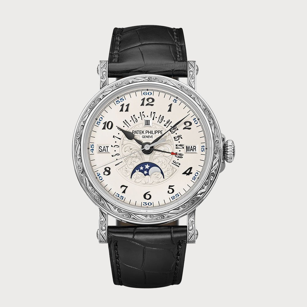 The Patek Philippe 5160/500G-001 is a masterpiece from the Grand Complications collection, featuring a 38mm white gold case with intricate hand engravings. Its silvery opaline dial showcases a retrograde date hand, day, month, leap year, and moon phase indicators, all adorned with gold Breguet numerals. Powered by the self-winding Caliber 324 S QR movement, it offers a 45-hour power reserve. The watch is completed with a black alligator leather strap and a hand-engraved white gold clasp.