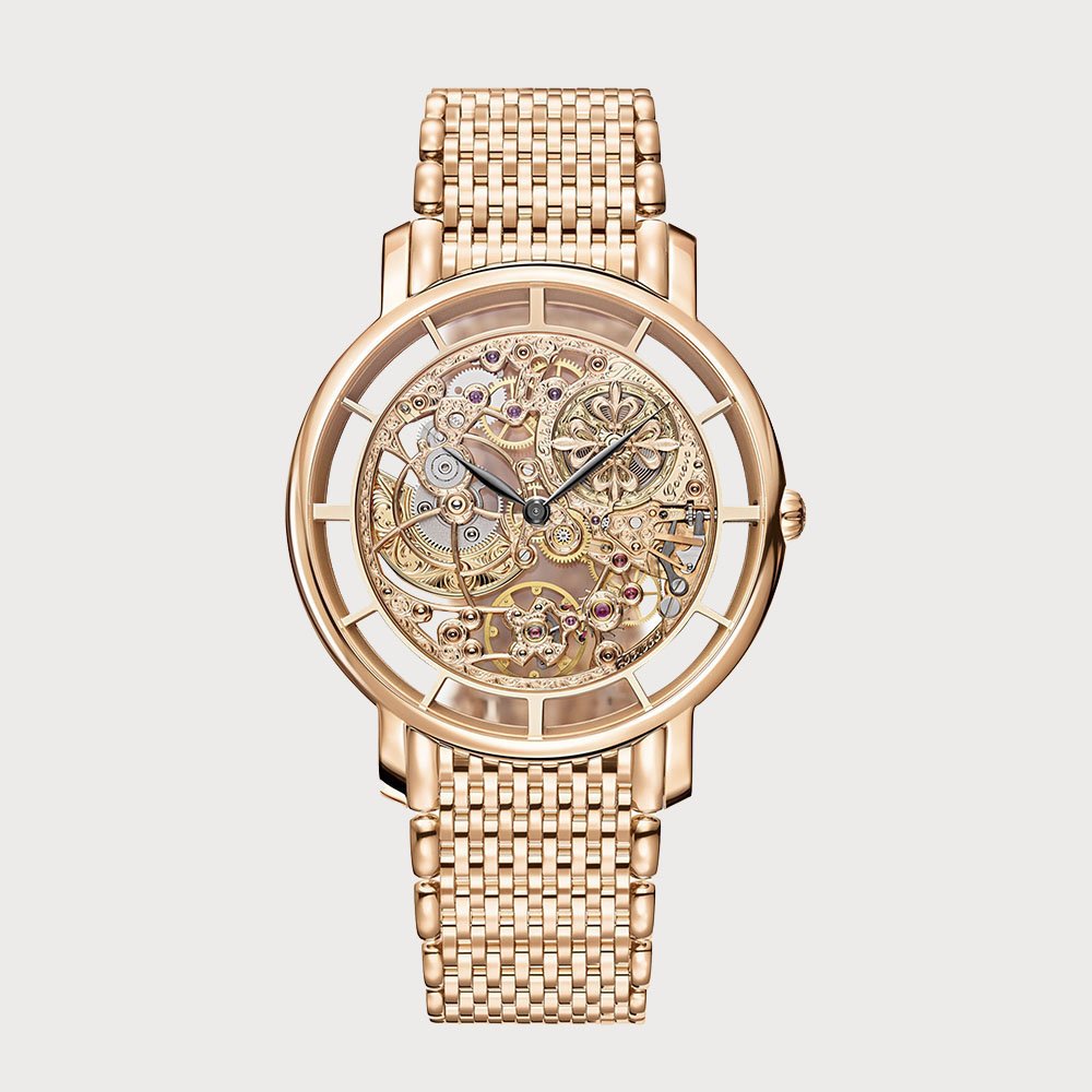 The Patek Philippe Calatrava Skeleton 5180/1R-001 is a masterpiece of horological artistry, featuring a fully skeletonized and hand-engraved ultra-thin self-winding movement. Encased in 18K rose gold, this timepiece showcases the intricate craftsmanship of Patek Philippe, with the engraving process alone requiring approximately 130 hours of meticulous work. The watch's design offers a captivating view of its mechanical heart, making it a true testament to the brand's dedication to rare handcrafts.