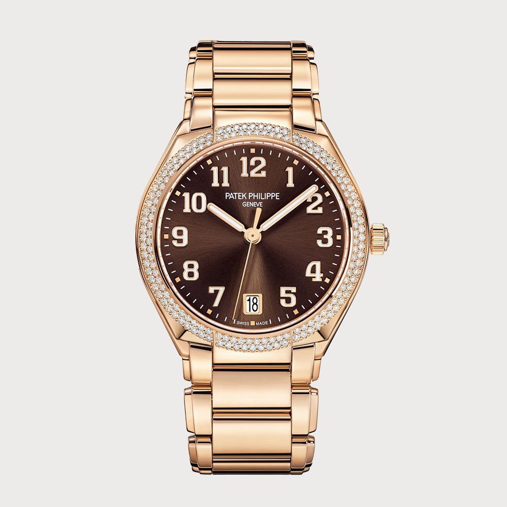 The Patek Philippe Twenty~4 Automatic (Ref. 7300/1200R-001) is a luxurious timepiece designed for the modern, active woman. Encased in 18K rose gold, it features a 36mm round case with a diamond-set bezel and a brown sunburst dial. Powered by the self-winding Caliber 26-330 S C movement, it offers hours, minutes, seconds, and date functions. The watch is water-resistant up to 30 meters and comes with a rose gold bracelet secured by a fold-over clasp.