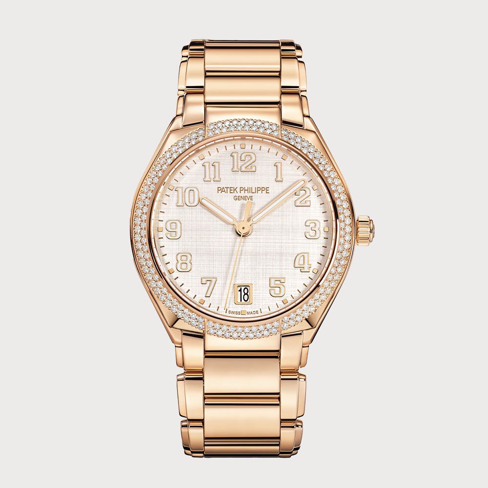 The Patek Philippe Twenty~4 Automatic 7300/1200R-010 is a luxurious timepiece designed for the modern, active woman. Featuring a 36mm round case crafted from 18K rose gold, this watch exudes elegance and sophistication. The bezel is adorned with 160 diamonds totaling approximately 0.77 carats, adding a touch of brilliance to its design. The silvery dial boasts a shimmering vertical and horizontal satin finish, reminiscent of wild shantung silk, and is complemented by gold applied numerals and luminescent hour markers. Powered by the self-winding Caliber 324 S C movement, it offers a power reserve of approximately 35 to 45 hours. The watch is water-resistant up to 30 meters and comes with a matching 18K rose gold bracelet secured by a fold-over clasp.